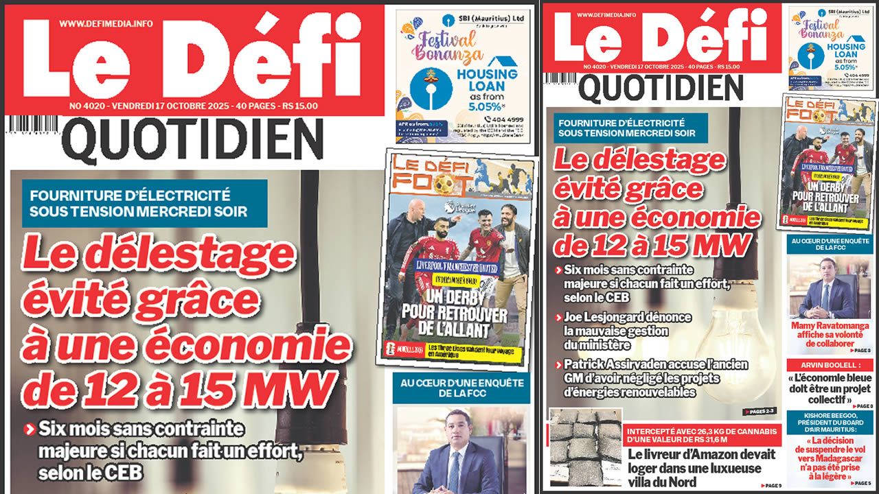 Voici la une du Défi Quotidien de ce Vendredi17 Octobre 2025
