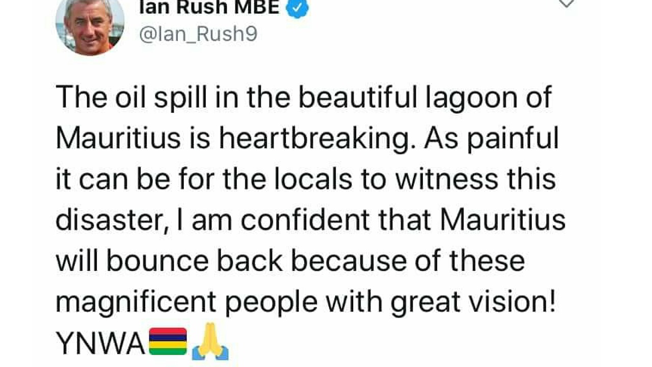 Ce jeudi 13 août, au tour de l'ex-footballeur Ian Rush, une légende de Liverpool, de dire sa peine devant ce désastre écologique. Il a tweeté : « Cette image de marée noire dans le magnifique lagon de Maurice est déchirante. Aussi douloureux que cette catastrophe puisse être pour eux, je suis convaincu que les merveilleux habitants de Maurice sauront surmonter cette épreuve. YNWA ».