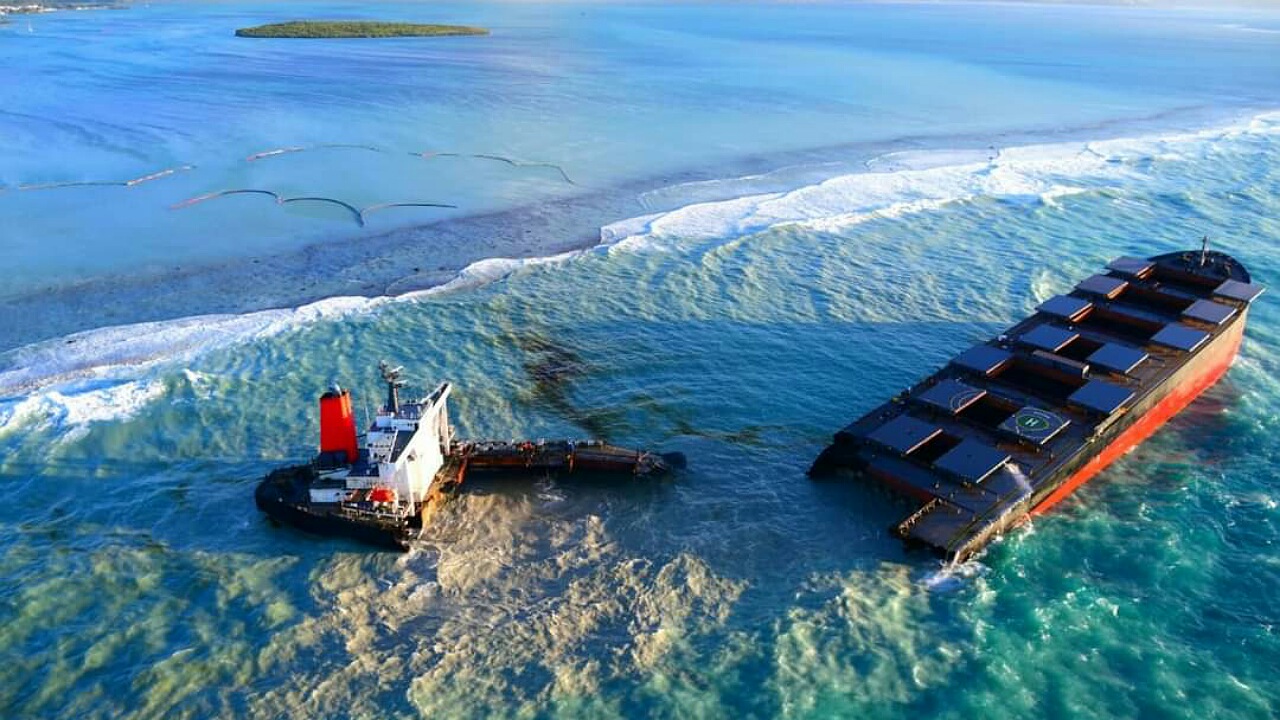 Le vraquier panaméen, le MV Wakashio, est entré dans sa fin de vie samedi après-midi. Le minéralier échoué, samedi 25 juillet, au large de Pointe-d'Esny alors qui se dirigeait à vide vers le Brésil, s'est scindé en deux. Entre-temps, l'un de ses réservoirs de carburant a déversé du fioul 12 jours après son échouement, provoquant une marée noire, la plus grande catastrophe écologique qu'ait connue le pays.