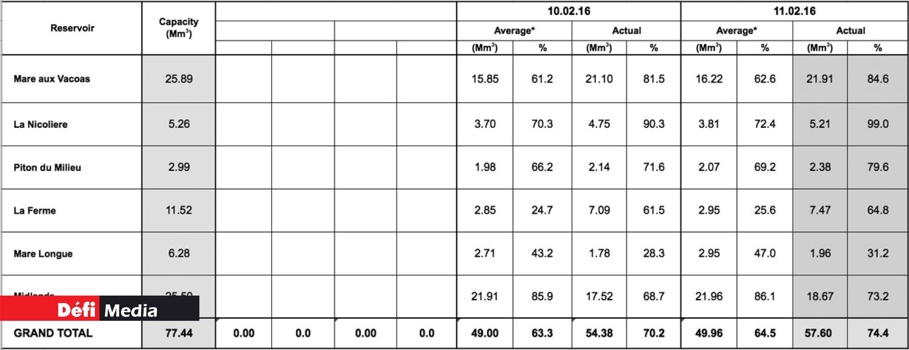 After the heavy rainfall, the country’s reservoirs have been filled up to 74.2%. La Nicoliere is at 99% of its capacity while Mare aux Vacoas is at 84.6%. Piton du Milieu 99%; La Ferme 64.8%; Mare Long 31.2%; Midlands Dam 73.2%. (See chart)