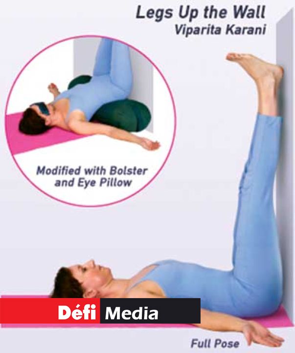 Forward bends will work to help release tension and get the body in a comfortable, physical state. To do the Uttanasana, first stand with your feet at hip-width distance. With your arms raised overhead, begin to slowly lower your upper body towards your legs. If you can’t reach the floor with your hands, you can bend your legs also and just fold your arms in front of you and reach for your elbows.[[{"type":"media","view_mode":"media_large","fid":"16512","attributes":{"class":"media-image wp-image-27898 alignright","typeof":"foaf:Image","style":"","width":"200","height":"232","alt":"Standing-Forward-Bend-or-Uttanasana"}}]]Legs up the wall or Viparita Karani