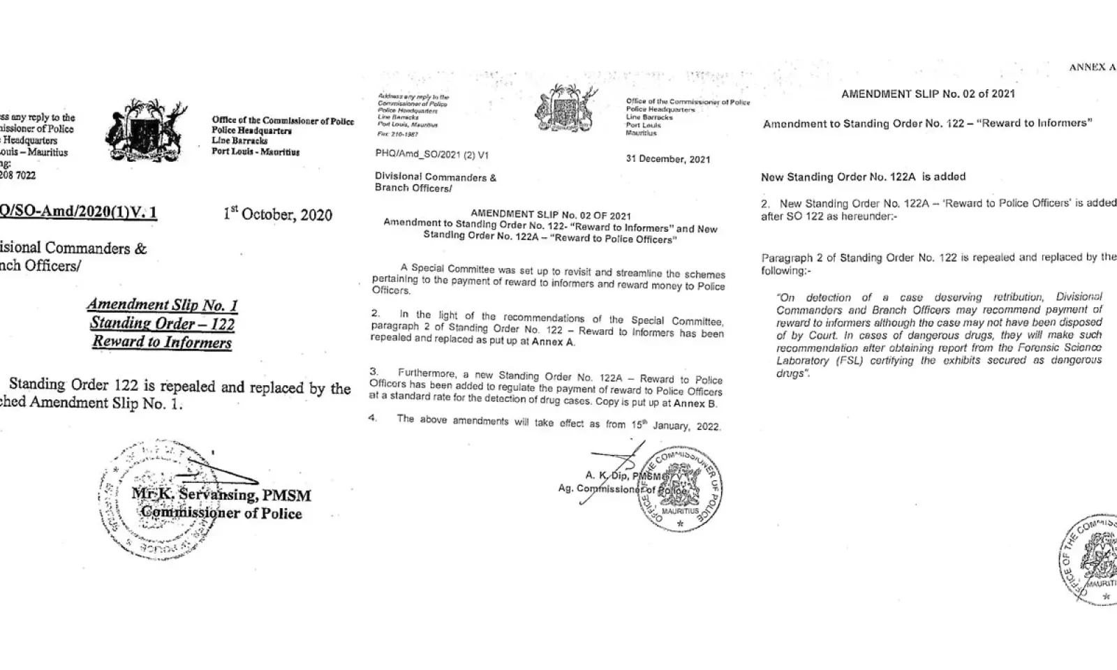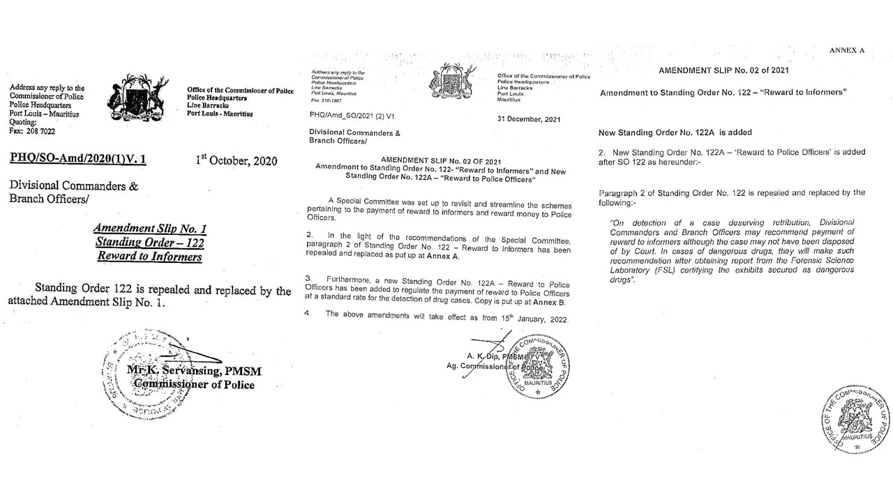 Trois hauts gradés des Casernes centrales ont apporté des amendements aux Standing Orders qui régissent la Police Act. Dans les documents que nous publions, on constate que l’ex-commissaire de police K.