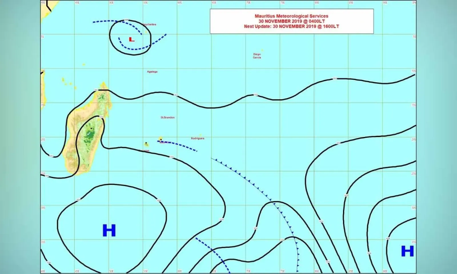 «Cette basse pression ne représente aucun danger pour Maurice pour l’heure. A ce stade, ce système n’influencera pas le temps dans les Mascareignes. On suit son évolution de très près», a affirmé le prévisionniste Vimal Mungul sur les ondes de Radio Plus à la mi-journée de ce samedi 30 novembre.